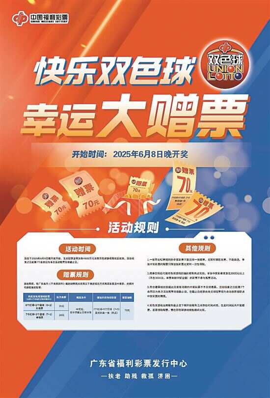活动期间,在广东省内(不含深圳市)福彩销售网点购买双色球游戏“6个红球+2个蓝球(6+2)”5倍(20元)或“7个红球+2个蓝球(7+2)”单倍(28元)彩票且中奖的(其他倍数均不包含在内),兑奖时可获赠面额价值70元的双色球游戏“7个红球+5个蓝球(7+5)”复式彩票一张。
