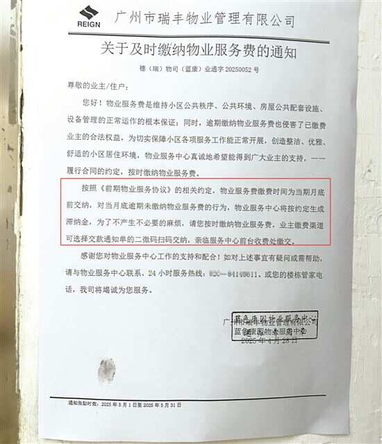 5月23日,记者来到位于海珠区滨江东路的蓝色康园小区。业主黄先生(化姓)告诉新快报记者,他每月都有按时缴费,此前不存在欠费行为。他提供的收费单显示,瑞丰物业在2025年5月3日发交款通知书时,要求黄先生缴纳2025年5月的物业服务费违约金,同时还要预收5-6月的物业服务费。