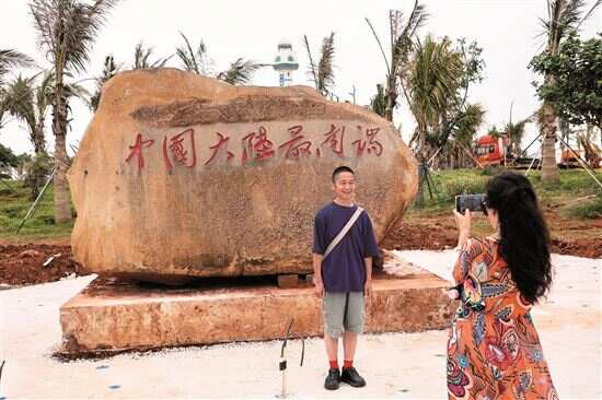 ■在角尾乡南极村灯楼角景区,游客在“中国大陆最南端”石碑前合影留念。