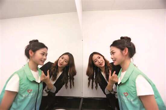 礼仪培训课上,吴怡吴悦姐妹俩为“小海豚”们示范标准的志愿者站姿。