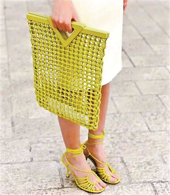 不喜欢或不习惯将大网格罩上身?那就拎在手边吧。前两季热度很高的各种渔网包还记得吗?不少大牌都出了这类轻便包款且街拍上镜率也很高。自由伸缩的弹力网兜包是最受欢迎的款式,时髦精可随意配搭自己喜欢的内胆包,适当外露不同物品的颜色,给整体造型装扮增加丰富感。