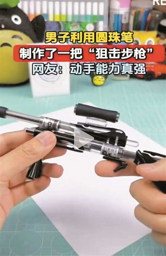 记者看到,视频中所谓的“改装”其实并不复杂,需要的原料无非是中性笔、书本夹、订书钉等常见的文具。主播会分段详细介绍改装方法,因为没有太过于烦琐的步骤,很容易就能学会并自行完成改装。为此,记者也进行了尝试,只用了差不多十分钟,就将中性笔改成“笔枪”。