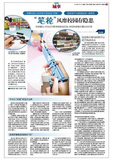 据媒体报道,已有同学在校园内使用“笔枪”打闹,不慎打中孩子眼睛,从而造成重大事故的案例。记者在视频的跟帖处亦留意到不少家长表达了对此的担心——“千万不要让我的孩子看到,孩子学会太危险”“希望学校能禁止这类‘武器’改造”。