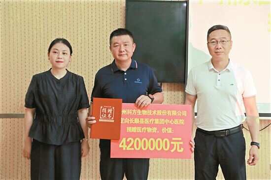 今年6月9日,广州东西部协作医疗设备捐赠仪式在长顺县医疗集团中心医院举行。郭海鹏与长顺县副县长曾琴琴共同为科方生物公司颁发捐赠奖牌及证书。曾琴琴表示,长顺县将用好一切帮扶资源,持续提升县域医疗服务能力,培育更多专业医疗人才,以更优质的医疗服务守护群众健康,推动长顺县医疗事业迈上新台阶。