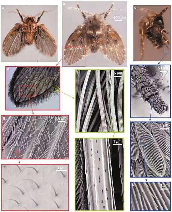 蛾蠓体表覆盖的数千根细毛并非装饰,在超高放大倍率的电子显微镜下,这些细毛呈现出精密的构造。每根毛的表面有许多纳米级别的细小沟槽,共同形成了类似荷叶表面的超疏水层。