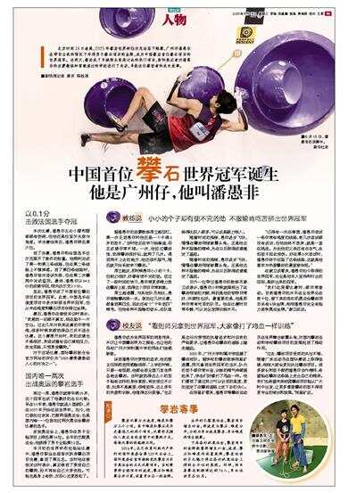 北京时间16日凌晨,2025年攀岩世界杯伯尔尼站落下帷幕,广州仔潘愚非在带伤出战的情况下夺得男子攀石项目的金牌,成为中国攀岩首位攀石项目的世界冠军。这两天,攀岩成了羊城街头巷尾讨论的热门项目,新快报记者对潘愚非的启蒙教练和曾就读过的学校进行了走访,寻找这位攀登者的成长故事。
