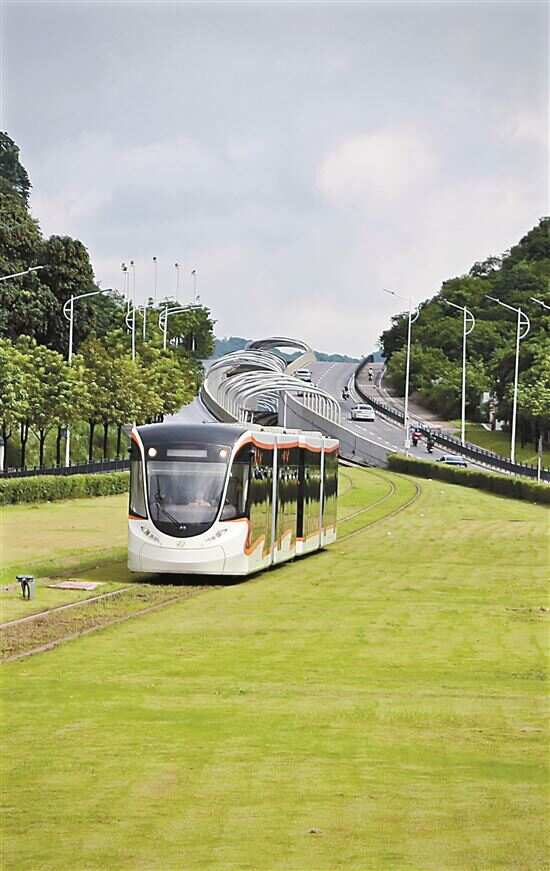 ■黄埔有轨电车2号线北段有轨电车驶入开源大道东站。 新快报记者 郭晴/摄