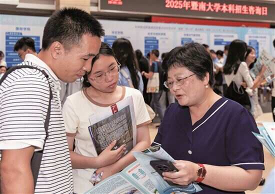 昨天9时许,暨南大学石牌校区图书馆内就已经人头攒动。图书馆大厅已变身“一站式咨询中心”,20余个学院的展位前排起长队,学校组织专业教师开展专业展示和咨询活动,为考生和家长提供面对面咨询服务,涵盖学院办学特色、人才培养体系等核心信息。