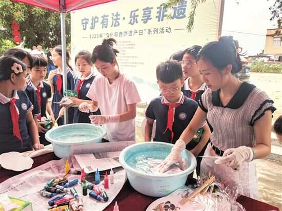 新快报讯 记者曾贵真 通讯员敖诗慧报道 6月18日,驻阳江市阳东区雅韶镇帮镇扶村工作队(以下简称“驻雅韶镇工作队”)联合阳东区博物馆、阳东区文化馆及阳东区非物质文化遗产保护中心,在省级文化和旅游特色村、中国传统古村落雅韶十八座举办“守护有法・乐享非遗——2025年‘文化和自然遗产日’系列活动”,深化文化遗产保护宣传教育,推动优质文化资源直达基层。活动以沉浸式体验与互动教学相融合的形式,为乡村文化振兴注入鲜活动能,吸引了阳东卓达学校40余名学生及当地村民积极参与。