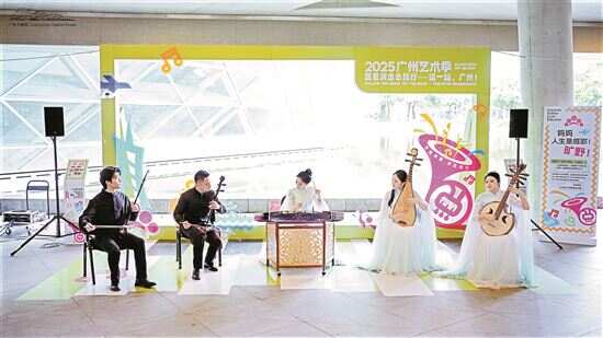 ■广东音乐曲艺团携高胡、二胡、琵琶、阮、扬琴等传统乐器现身广州大剧院斜柱“艺公里”空间,为市民带来了一场即兴快闪。
