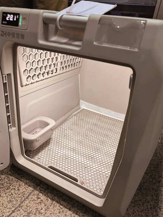 据介绍,箱子自带新风系统,可以保持箱内通风,温度基本与车厢内一致,二十五六摄氏度。需要时,工作人员还会在应急窗口上放冰盒,这样通过新风吹出的风是凉的,可以进一步帮宠物降温。