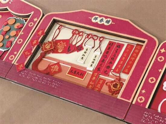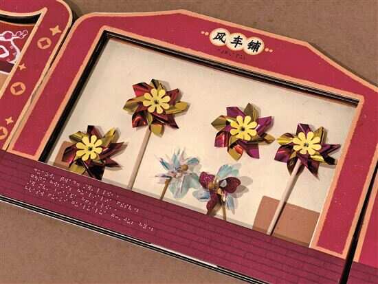另一边则展出了他们一套完整册页作品《广府花市触摸书》,同样是涵盖上述花街元素和盲文功能,但形式和样式均以更精致的设计呈现。