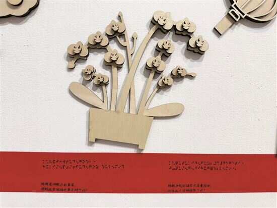 《我们的花街》作品从传统花街中选取了六个最能代表广州花街的元素,比如标志性的景观“花街牌楼”,兰花、年桔、桃花等具有代表性的年花,还有转运风车、挥春以及挂件等。创作者黄诗婷、杨海钰、莫晶媚三人通过有凹凸感的图形创作并配以作为解说的盲文组成,挂贴在墙壁上,延展出约十米的展览动线,地下更设置导盲线,营造出丰富的视障感受空间。