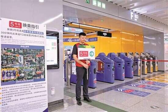 新快报记者现场测算,从五羊邨十号线F口到五号线A口换乘耗时6分钟。记者从十号线的蓝色换乘闸机出来后坐扶梯出站,沿着寺右新马路步行300米,再下楼梯进入站厅,过安检后再次通过蓝色换乘闸机进站。尽管站外的广州地铁指示柱有明确指出换乘时间6分钟,但是一趟走下来还是有种“路漫漫”的感觉。