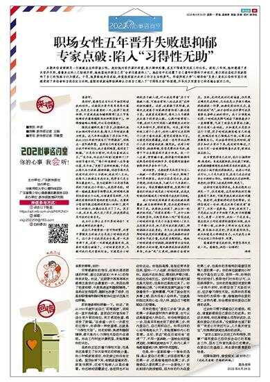 本期来信者婷婷是一位兢兢业业的职场女性。起初她对晋升满怀希望,每天精神抖擞,甚至不惜通宵完成工作任务。然而,5年间,她却遭遇了多次晋升失败,看着身边的人已陆续升职,她绝望地怀疑自己是“全单位最差的人”。她在信中还坦露了自己童年时期的不幸经历,意识到这些经历深刻影响了自己的性格与行为模式。于是,她勇敢地来信求助,希望找到面对未来工作与生活的勇气。华南师范大学“心晴热线”负责人袁杰从信的字里行间感受到了来信者的自我否定与内耗,温暖而深刻地帮助婷婷认识到自己陷入了“习得性无助”的困境,开导对方用爱自己的思维去面对工作。
