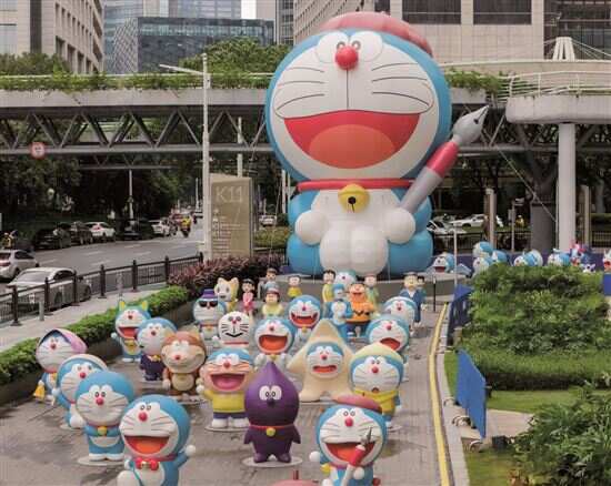 本次哆啦A梦特展中,广州K11特在L2层与B1层特设哆啦A梦快闪店(含普通与专属区域),发售广州站独家主题纪念品,如展览特别款磁吸毛绒玩具、广州城市哆啦A梦小羊造型扭蛋、限量手办,“紫薯”哆啦A梦拉杆箱等,引起了更多本土消费者的情感共鸣。