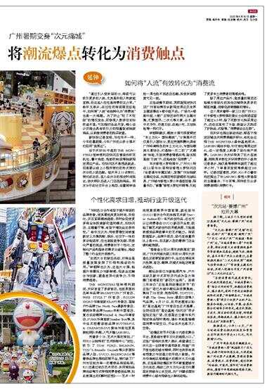 “次元站·赛博广州”是继“行花街·花样广州”“萌宠园·趣野广州”“广交汇·好采广州”“同船渡·粤韵广州”后,“羊城消费新八景”中的第五景,将依托萤火虫动漫游戏嘉年华等动漫知名展会,超级飞侠、猪猪侠、喜羊羊等广州本土动漫IP,在暑假期间推出“二次元狂欢周”“超级飞侠带你游工厂”等动漫主题系列活动,并深入挖掘与开发广州动漫IP“泛二次元衍生品”。