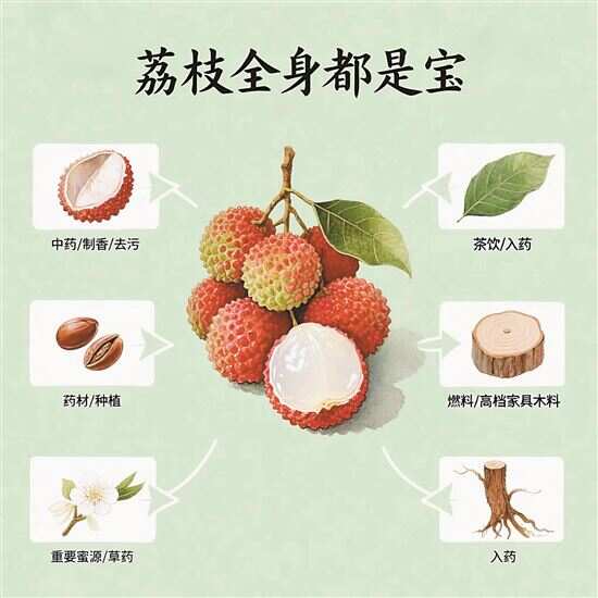 此外,据《本草纲目》记载,荔枝木能够止血、止痛、调节气血,树皮和树叶可以用于治疗疾病。