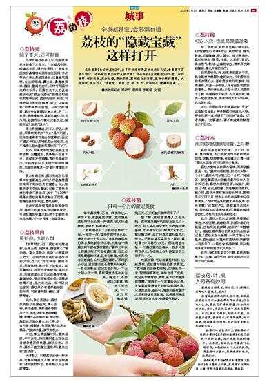 在热播剧《长安的荔枝》中,为了将岭南鲜果荔枝运送回长安,李善德可谓绞尽脑汁。这岭南佳果为何如此受青睐?白居易在《荔枝图序》中写道,“朵如葡萄,核如枇杷,壳如红缯,膜如紫绡,瓤肉莹白如冰雪,浆液甘酸如醴酪。大略如彼,其实过之。”荔枝除了果肉,壳、核、木、叶、花等均是“隐藏的宝藏”。