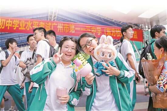 ■7月2日上午,2025年广州中考笔试顺利结束,考生在考场外与家长、同学一起庆祝这一欢乐时刻。