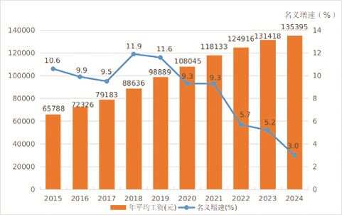 ■2015年至2024年广东城镇非私营单位就业人员年平均工资及增速。 资料来源:广州市统计局