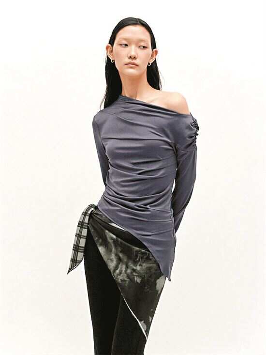 通过腰身处的褶皱细节与单肩形成“隐藏的平衡”,打造风格自洽的“失衡”。