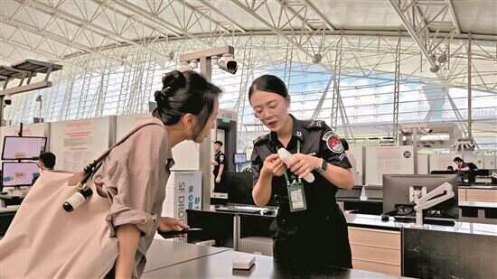 ■白云机场安检人员为旅客讲解充电宝携带须知。通讯员供图