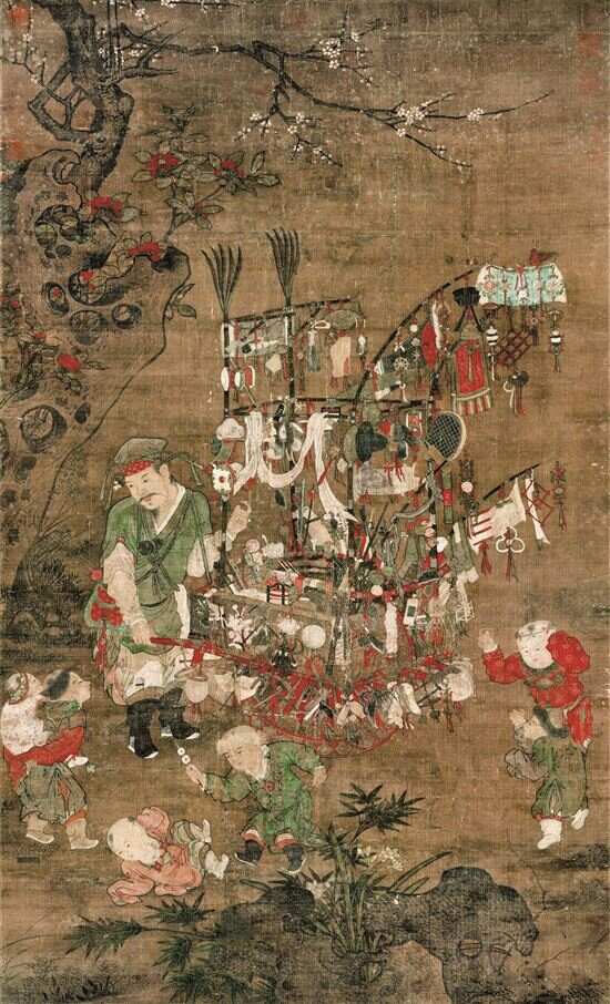 现藏北京故宫博物院的一幅尺幅较大的横幅《货郎图》是南宋李嵩的作品,李嵩尤为注重表现日常百姓的生活状态,有着较强的乡土气息。他多次绘制《货郎图》,从中可看出他对百姓生活的异常关注,他在作品描绘货郎下乡卖货时的场景,充分还原了乡间百姓的真实生活状态。