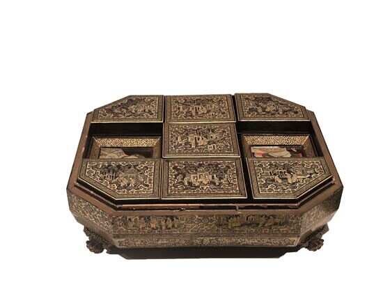 在晚清广州,不少精美的外销游戏套盒为海外订购,甚至有专门的家族徽章。这些来自中国的盒子装饰着中国风情的庭院、人物,有些是为了方便装扑克牌和筹码,有些游戏盒里有七巧板、九连环、中国梯、皇家秤等各种源自中国,或者托名源自中国的益智玩具。