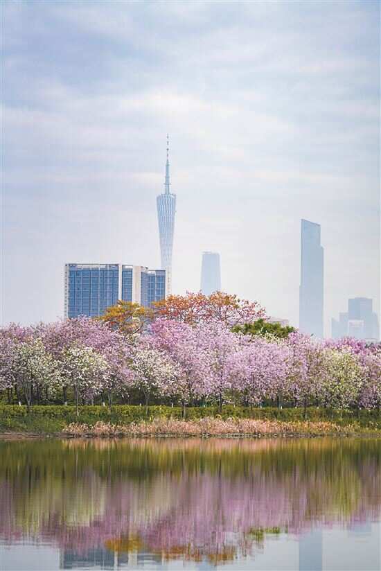 ■海珠湿地公园鲜花盛放,与远处的城市地标建筑交相辉映,美不胜收。(资料图) 新快报记者 郭思杰/摄