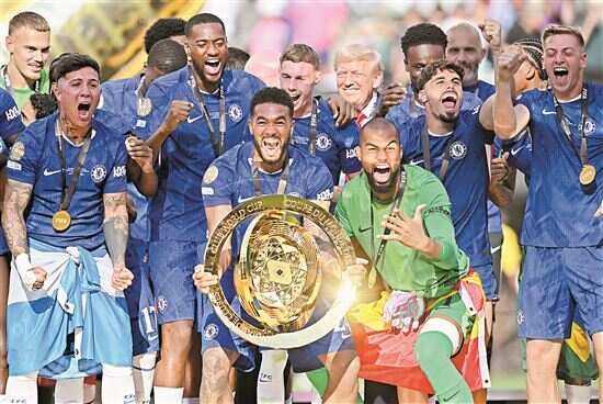 7月13日,切尔西队球员在颁奖仪式上捧起奖杯。新华社发