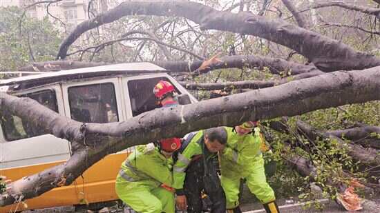 ■7月20日,今年第6号台风“韦帕”登陆广东,多地迎狂风暴雨。当天,深圳市罗湖区消防救援大队的消防救援人员将因树木和路灯倒塌而被困车内的人员救出。新华社发