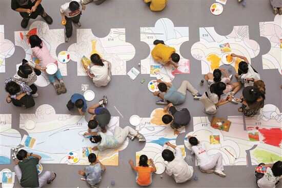 ■7月28日,第九届广东青少年书画大赛——“我的城市我的十五运”巨幅拼图绘画活动在广州艺术博物院(广州美术馆)中庭举行。近200名小画家现场创作,用巨幅拼图绘画迎接十五运会倒计时100天。新快报记者 毕志毅/摄