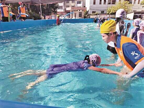 ■志愿者正在教小营员如何练成“小飞鱼”。