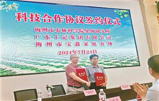 ▲梅州市农林科学院果树研究所与广东十记集团有限公司、宝鑫家庭农场签署示范点建设协议。