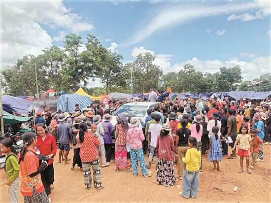 ■7月29日,柬埔寨边境的撤离人员在奥多棉吉省的一处安置场所领取救济物资。新华社发