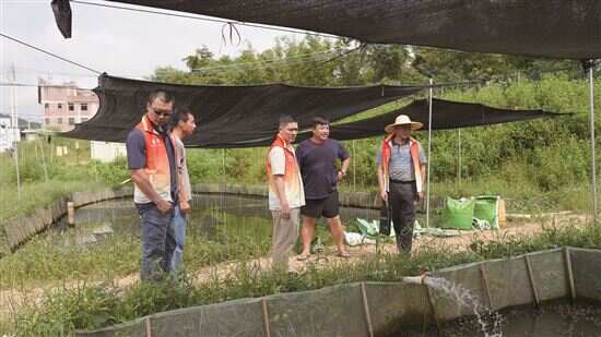 ■周爱文(右一)和工作队队员一起走访养殖基地。