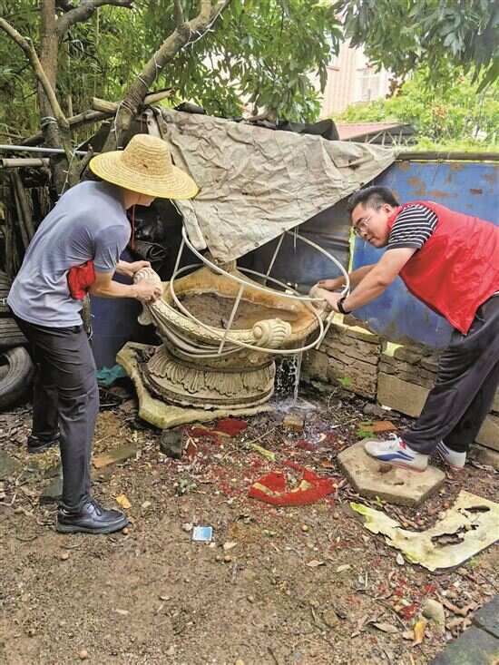 增城区新塘镇针对花丛积水开展翻盆倒罐、清理杂物等行动。