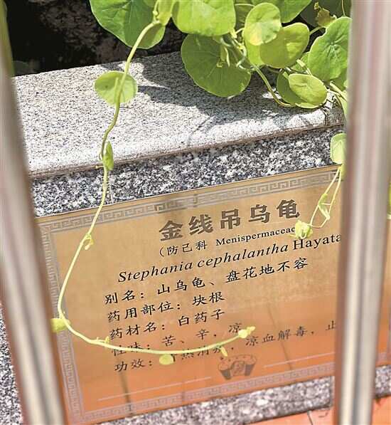 在进入抱朴园之前,且先驻足两分钟,右手边的龙涎瀑前,有据说是“镇园之宝”的植物金线吊乌龟,如果你觉得这个名字有意思,那你再看看它另外一个别名“盘花地不容”,一个比一个牛。金线吊乌龟的药用部分是块根,称为“白药子”,也是清热消炎、凉血解毒的好手。