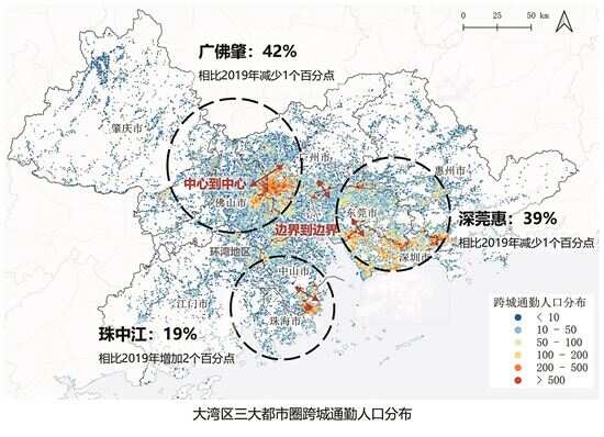 其中,广州与佛山、深圳与东莞、珠海与中山、广州与东莞之间是跨城通勤密集区域,体现湾区在上下游产业、技术研发与成果转化、生活和就业等的一体化协作。