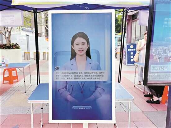 ■7月31日,广州市荔湾区华林街道零距离专场招聘会在上下九就业驿站门前举办,工作人员向群众介绍AI就业面试机。