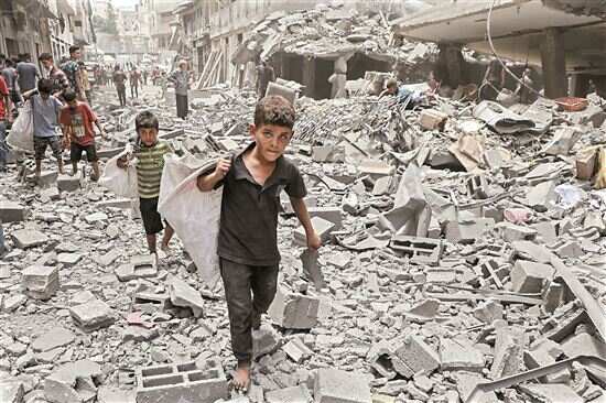 ▲8月8日,孩子们在加沙城以军袭击后的废墟上搬运物品。