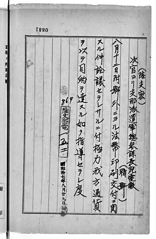 (一)侵华日军中国派遣军1942年8月12日向日本陆军省呈报的《关于印制和交付二十九年及三十年版重庆方面法币的请示》。