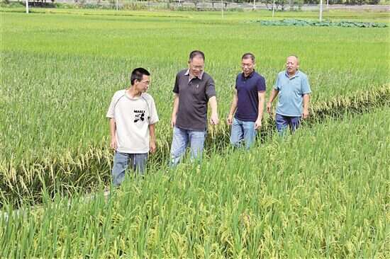 驻永和镇工作队队长欧阳光(左二)带队到田间了解水稻种植情况。