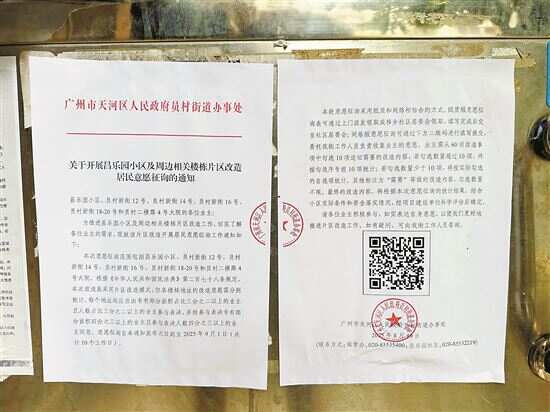 8月21日,天河区员村街道办相关工作人员也向新快报记者证实,上述意愿征询属于老旧小区改造范畴,并非征拆。改造的目的是对老旧小区公共区域与设施进行修缮更新,解决房屋安全隐患,改善居住环境。例如,对公共区域的休闲区、道路等进行翻新;对上世纪70年代建造的建筑外立面修补翻新,解决渗水问题;整治弱电线杂乱现象等。