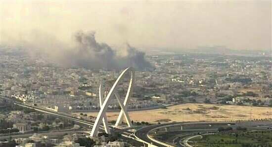 ■9日,多哈北部的袭击现场,浓烟四起。(来源:央视新闻)