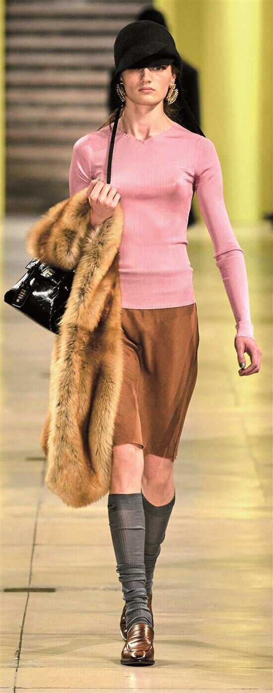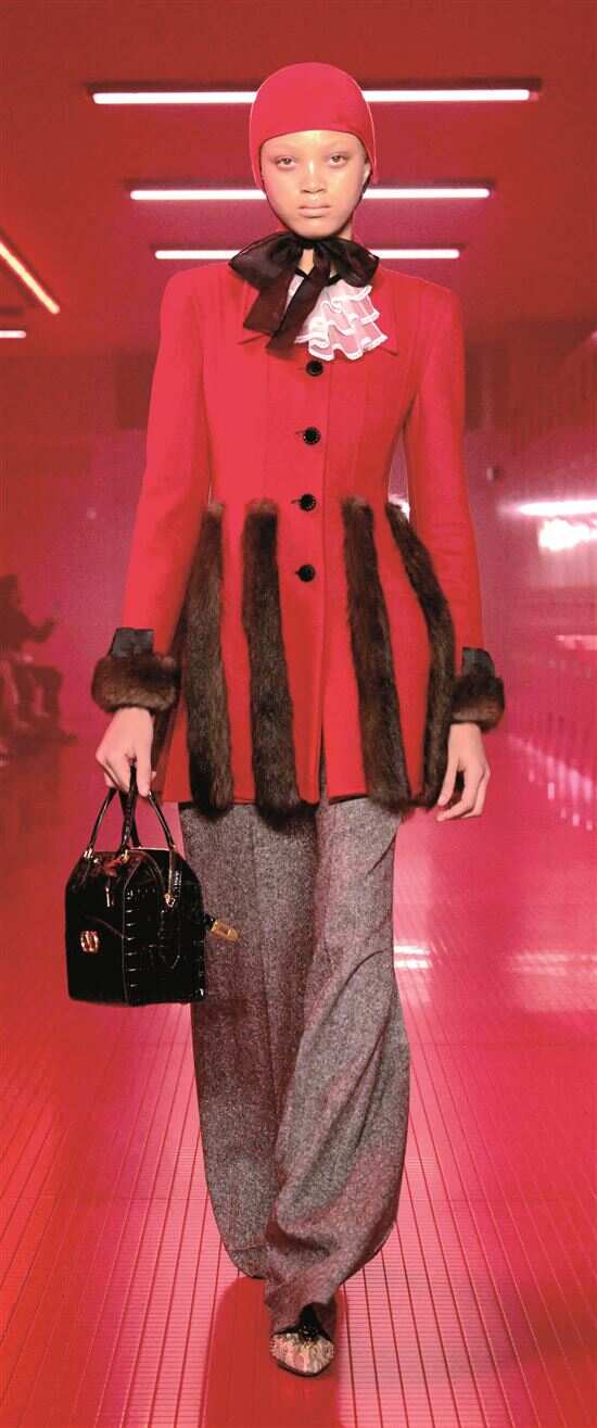 2025秋冬时装周上不少品牌应用了漆皮、麂皮、毛呢、丝绒、羊毛、鎏金刺绣等“闪亮”质感材质,搭配流苏围巾、薄纱飘带、羽毛装饰等流动感较强的配饰,为整体造型增加熠熠生辉之感。而在以棕色系、大地色系为基调的光泽材质中,皮草的出镜率直线攀升,大多品牌采用仿皮草且不再全身覆盖,以边饰形式点缀在袖口、领缘、裙摆或包袋上。也有皮草“拖拽”即随意拎在手中或挎在手臂间,再或是变成包或兔子玩偶造型等,这种混搭少了厚重感,多了年轻与俏皮。