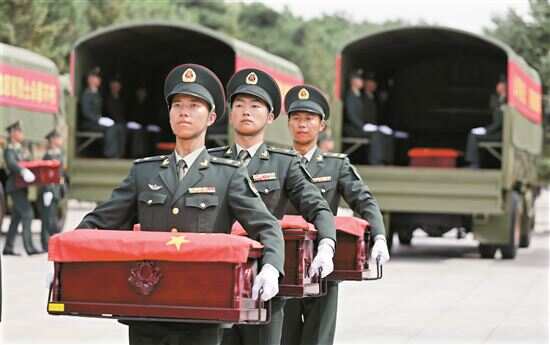 中方在仁川国际机场举行庄严悼念仪式,唱响激昂雄壮的中华人民共和国国歌《义勇军进行曲》,中国驻韩国大使为志愿军烈士棺椁一一覆盖国旗,全体人员向志愿军烈士遗骸行三鞠躬礼,中国人民解放军仪仗司礼大队礼兵手持国旗引路,怀抱烈士棺椁登上解放军空军运-20专机。