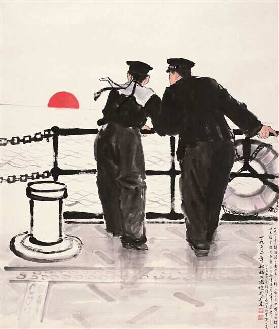 六十年代他画了《浴日图》,两个海军在甲板上,这张画用了大写意的水墨语言,据他自己说,甲板上积水的透明感觉是受了齐白石画虾的技法启发。