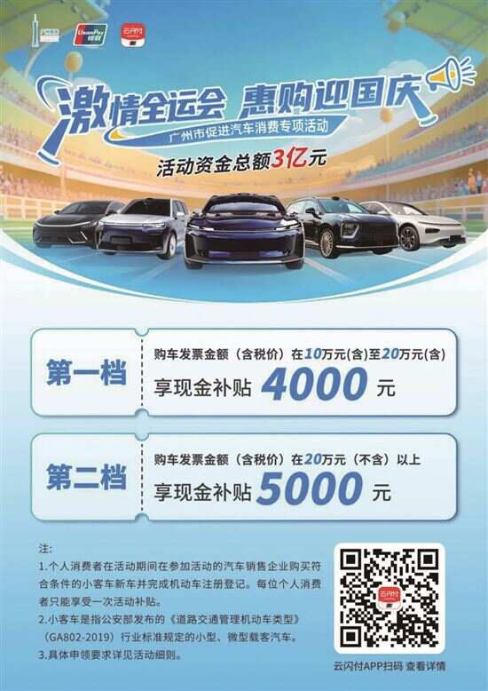 新快报讯 记者陆妍思 通讯员穗商务宣报道 9月14日,记者从广州市商务局获悉,广州市促进汽车消费专项活动启动,9月15日-30日购车最高补贴5000元,总额共3亿元,先到先得,用完即止。“云闪付APP活动专区”将于9月15日14时上线。